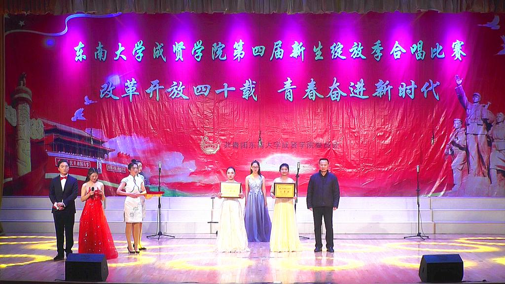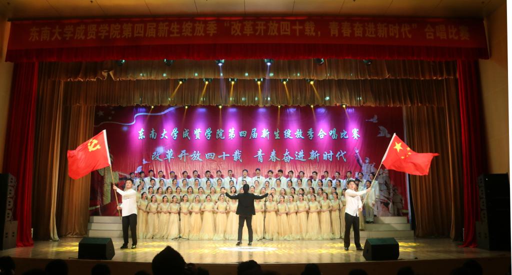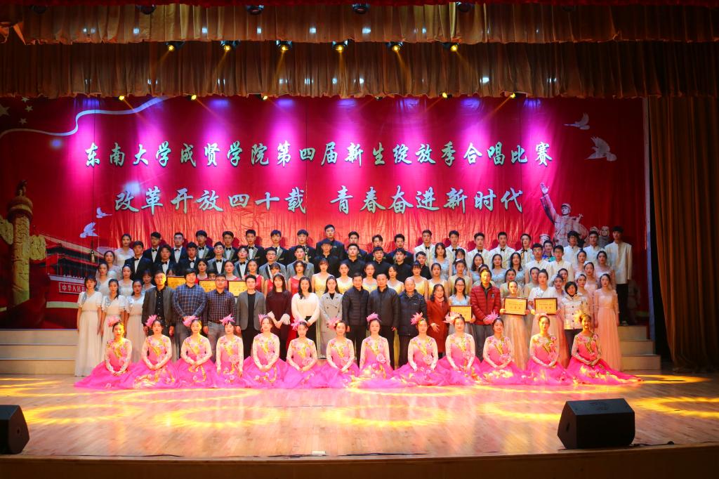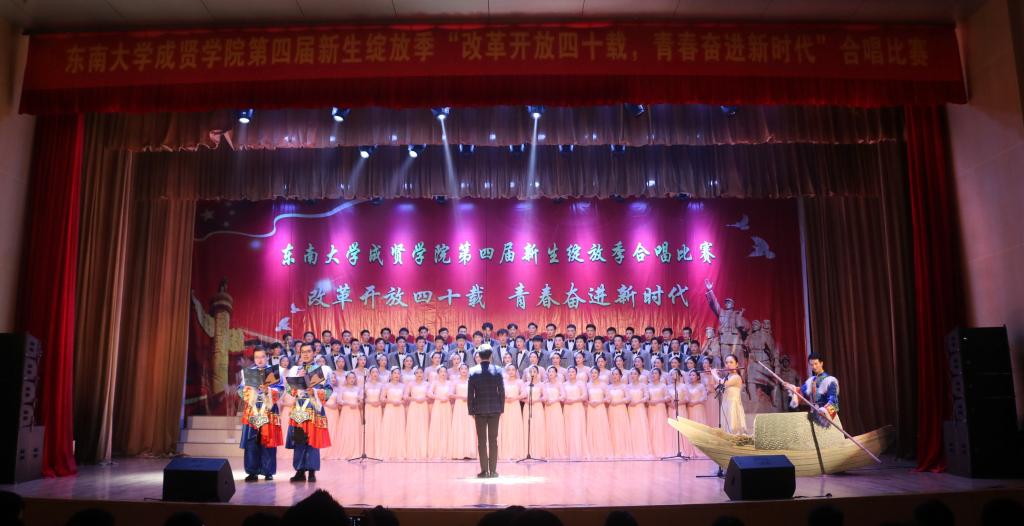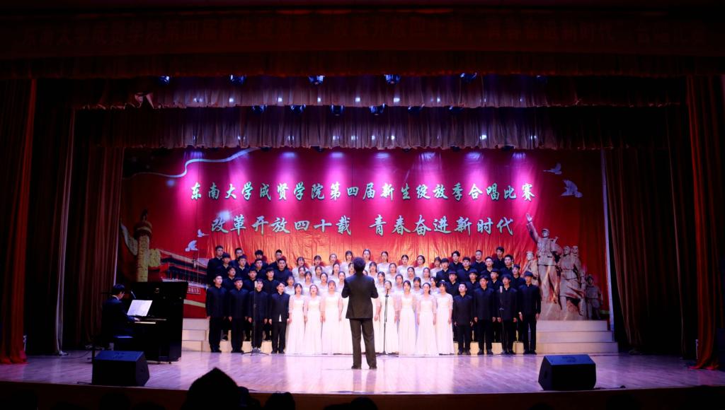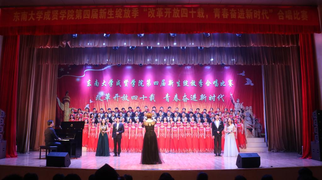 比赛中,大学生艺术指导中心音乐团倾情演绎歌曲《望春风》,展现了经典民谣的优美旋律;各学院老师积极参与指导与演出,师生们通力合作,用铿锵有力、激昂向上的歌声引发了观众对改革开放四十周年来伟大变革的共鸣,充分表达出成贤学子更加坚定走中国特色社会主义道路、改革开放道路的信心与决心。比赛在全场齐唱雄壮的《69vj 校歌》声中圆满结束。
