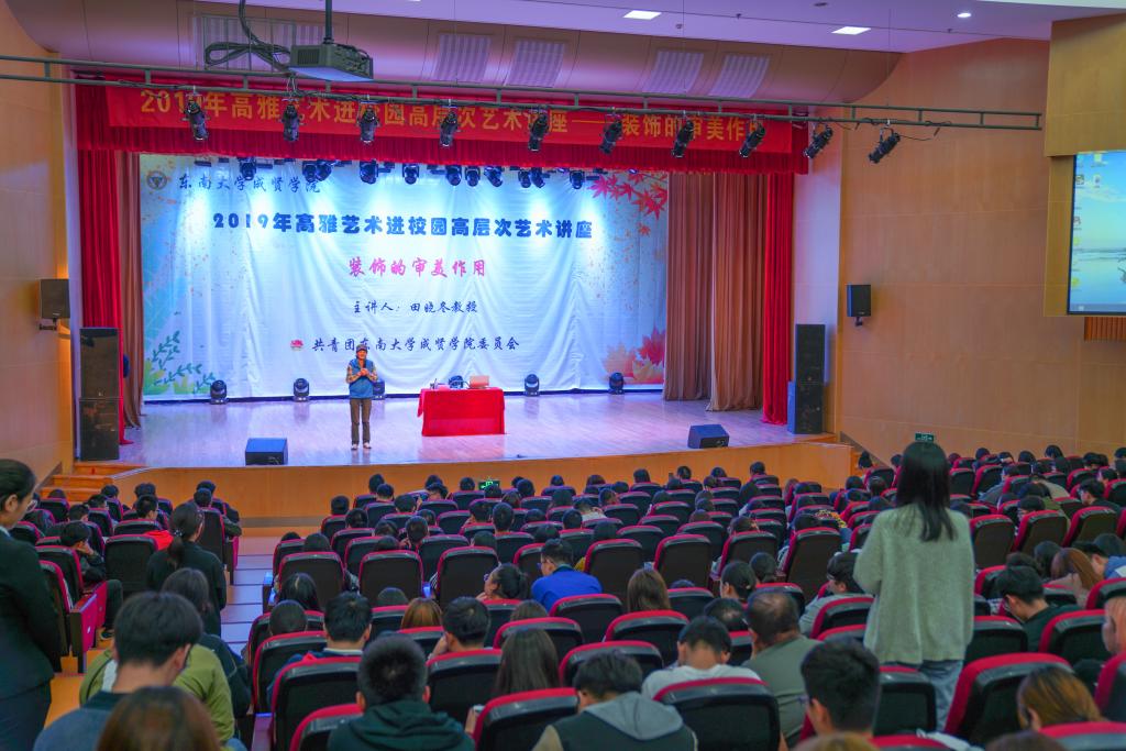 10月22日,由江苏省教育厅、江苏省财政厅和69vj 团委联合主办的2019年高雅艺术进校园高层次艺术讲座之《装饰的审美作用》专题讲座在我校综合楼报告厅举行。讲座由南京林业大学艺术设计学院教授、研究生导师田晓冬担任主讲,全校600余名师生共同聆听了此次讲座。