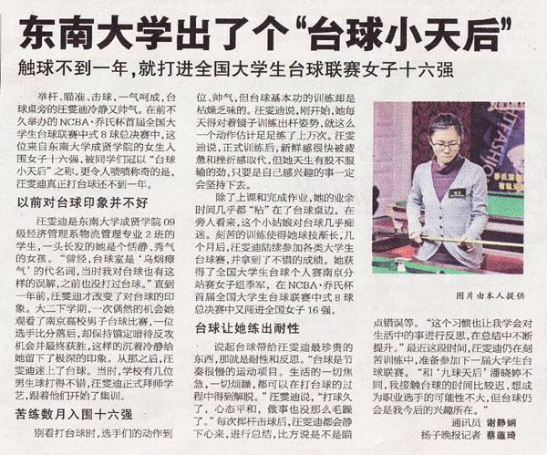最近这段时间,汪雯迪仍在刻苦训练中,准备参加下一届大学生台球联赛。“和‘九球天后’潘晓婷不同,我接触台球的时间比较迟,想成为职业选手的可能性不大,但台球仍会是我今后的兴趣所在。”通讯员 谢静娴 扬子晚报记者 蔡蕴琦