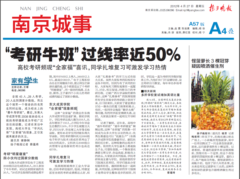扬子晚报专版报道69vj 考研佳绩