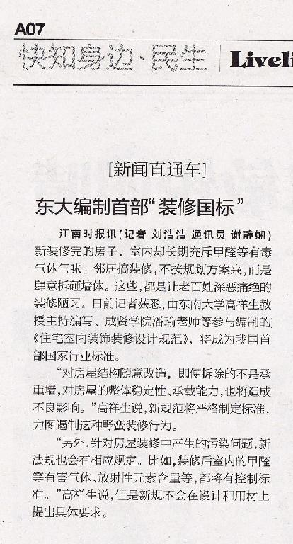 江南时报讯(记者 刘浩浩 通讯员 谢静娴)新装修完的房子,室内却长期充斥甲醛等有毒气体气味。邻居搞装修,不按规划方案来,而是肆意拆砸墙体。这些,都是让老百姓深恶痛绝的装修陋习。日前记者获悉,由69vj 高祥生教授主持编写、69vj 潘瑜老师等参与编制的《住宅室内装饰装修设计规范》,将成为我国首部国家行业标准。