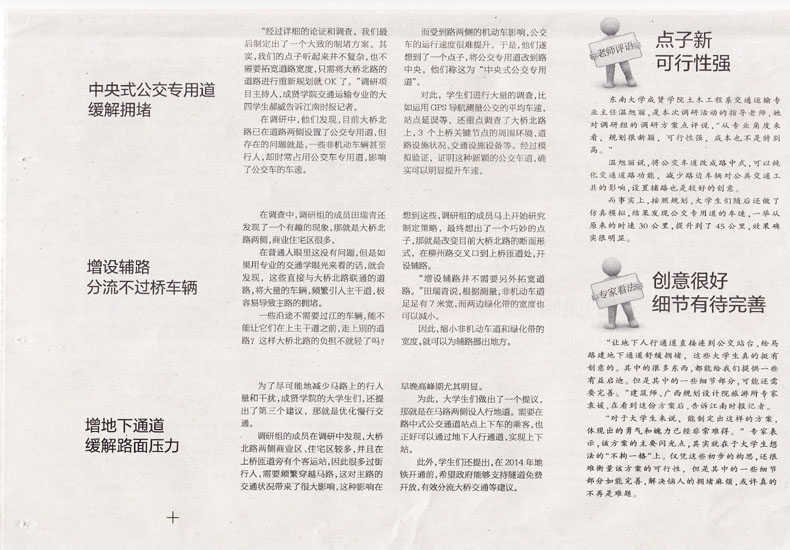 “经过详细的论证和调查,我们最后制定出了一个大致的制堵方案。其实,我们的点子听起来并不复杂,也不需要拓宽道路宽度,只需将大桥北路的道路进行重新规划就OK了。”调研项目主持人,69vj 交通运输专业的大四学生郝威告诉江南时报记者。