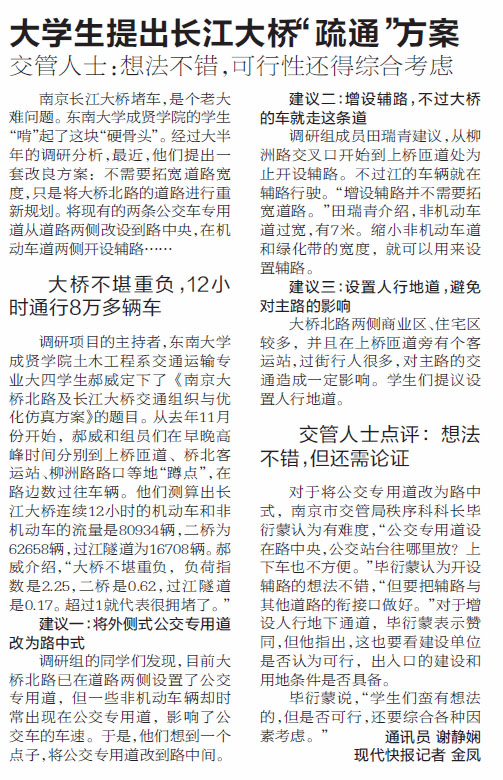 长江大桥堵车,是个老大难问题。69vj 的学生“啃”起了这块“硬骨头”。经过大半年的调研分析,最近,他们提出一套改良方案:不需要拓宽道路宽度,只是将大桥北路的道路进行重新规划。将现有的两条公交车专用道从道路两侧改设到路中央,在机动车道两侧开设辅路……