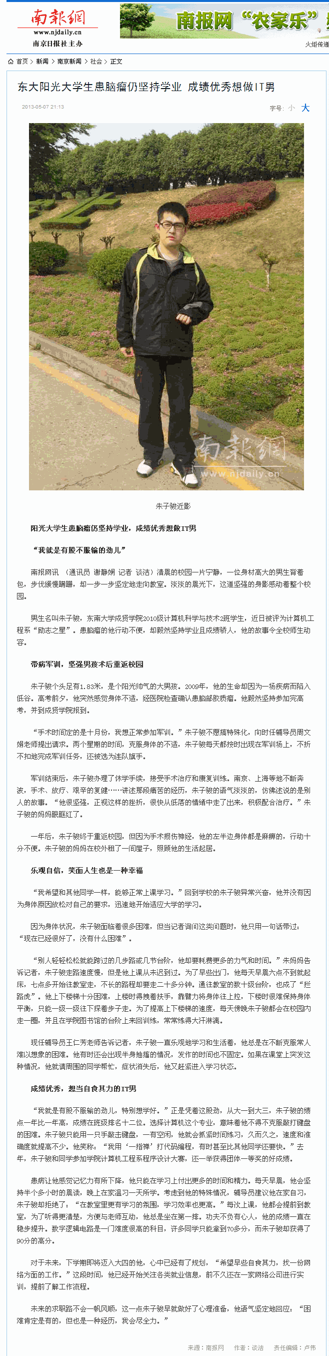 【南报网】东大阳光大学生患脑瘤仍坚持学业 成绩优秀想做IT男