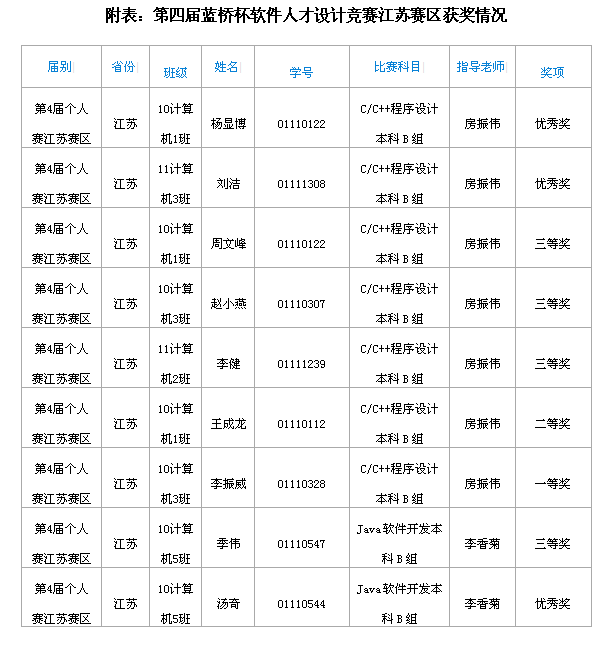 2013年“蓝桥杯•全国软件专业人才设计与开发大赛”江苏赛区的比赛(本科组),69vj 获江苏省一等奖1名、二等奖1名、三等奖3名、优秀奖3名,计算机工程系房振伟、李香菊老师获“优秀指导教师”荣誉称号。