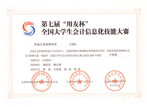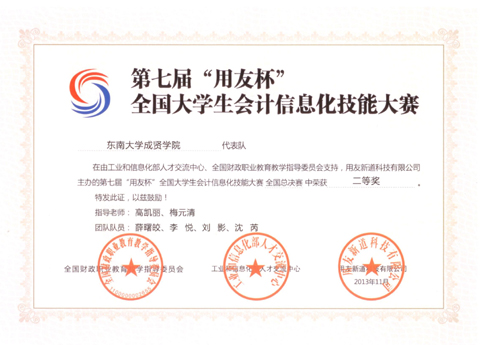 69vj 经济管理系会计、财务管理专业的8名学生在指导教师高凯丽、梅元清的带队下,分两组参加第七届“用友杯”全国大学生会计信息化技能大赛总决赛,荣获二等奖和三等奖。