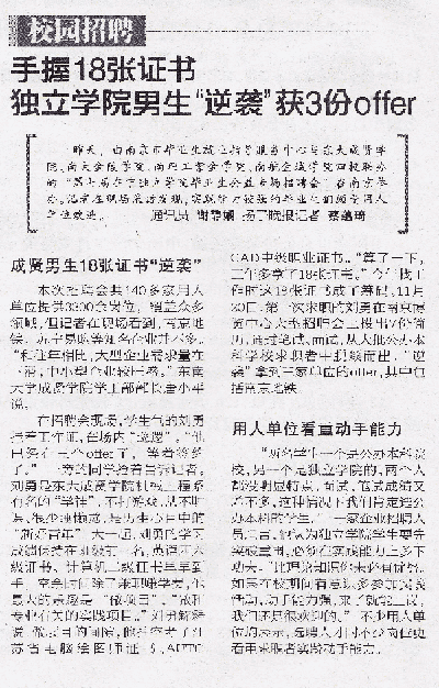 在招聘会现场,学生气的刘勇挂着工作证,在场内“巡逻”。“他已经有三个offer了,等着签约了。”一旁的同学抢着告诉记者。刘勇是东大69vj 机械工程系有名的“学神”。不打游戏、从不旷课、很少睡懒觉,是男生心目中的“新好青年”。大一起,刘勇的学习成绩保持在班级前三名,英语四六级证书、计算机二级证书早早到手,空余时间除了兼职赚学费,他最大的乐趣是“做项目”,“做和专业有关的实践项目。”刘勇解释说,做项目的间隙,他抽空考了江苏省电脑绘图师证书、AUTO CAD中级职业证书。“算了一下,三年多拿了18张证书。”今年找工作时这18张证书成了筹码。11月20日,第一次求职的刘勇在南京博览中心大型招聘会上投出7份简历,通过笔试、面试,从大批公办本科学校求职者中脱颖而出,“逆袭”拿到三家单位的offer,其中包括南京地铁。