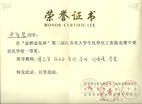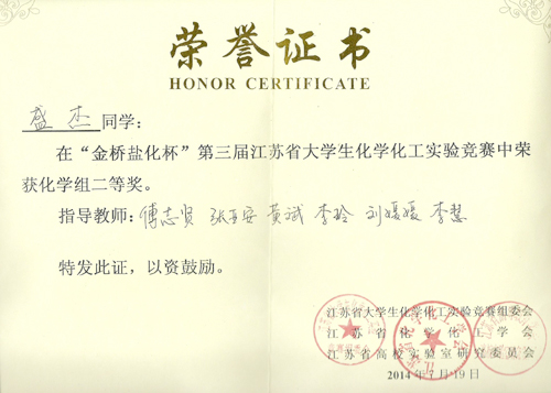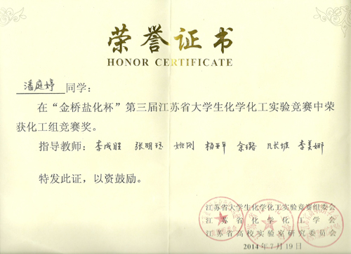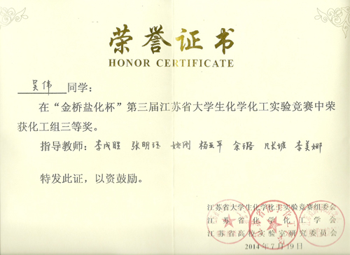 69vj 化工与制药工程系六名学生参加“金桥盐化杯”第三届江苏省大学生化学化工实验竞赛,取得了化学组一等奖(1名)、二等奖(1名),化工组三等奖(2名)、竞赛奖(1名)的好成绩。