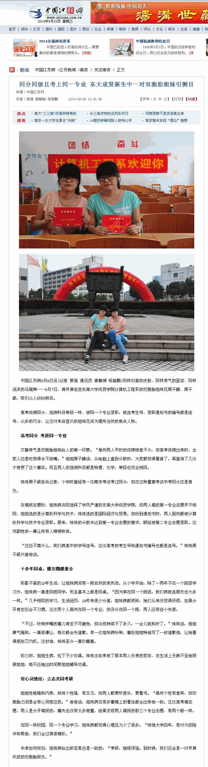 【中国江苏网】同分同级且考上同一专业 东大成贤新生中一对双胞胎姐妹引侧目