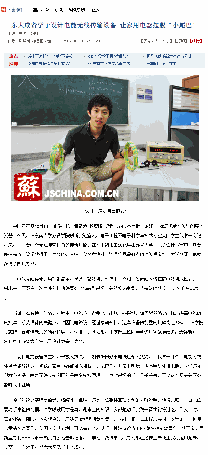 【中国江苏网】东大成贤学子设计电能无线传输设备 让家用电器摆脱“小尾巴”
