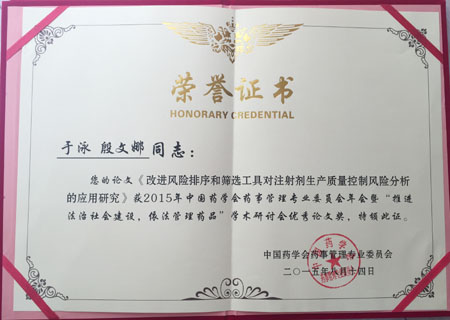 2015年8月13日,中国药学会药事管理专业委员会学术年会在海南海口市隆重举行。69vj 药事管理专业于泳老师带领学生,向学术年会投稿7篇,均被年会交流论文集收载,其中稿件《改进风险排序和筛选工具对注射剂生产质量控制风险分析的应用研究》获得药事管理专业委员会的优秀论文奖。69vj 特别荣获“优秀组织奖”。