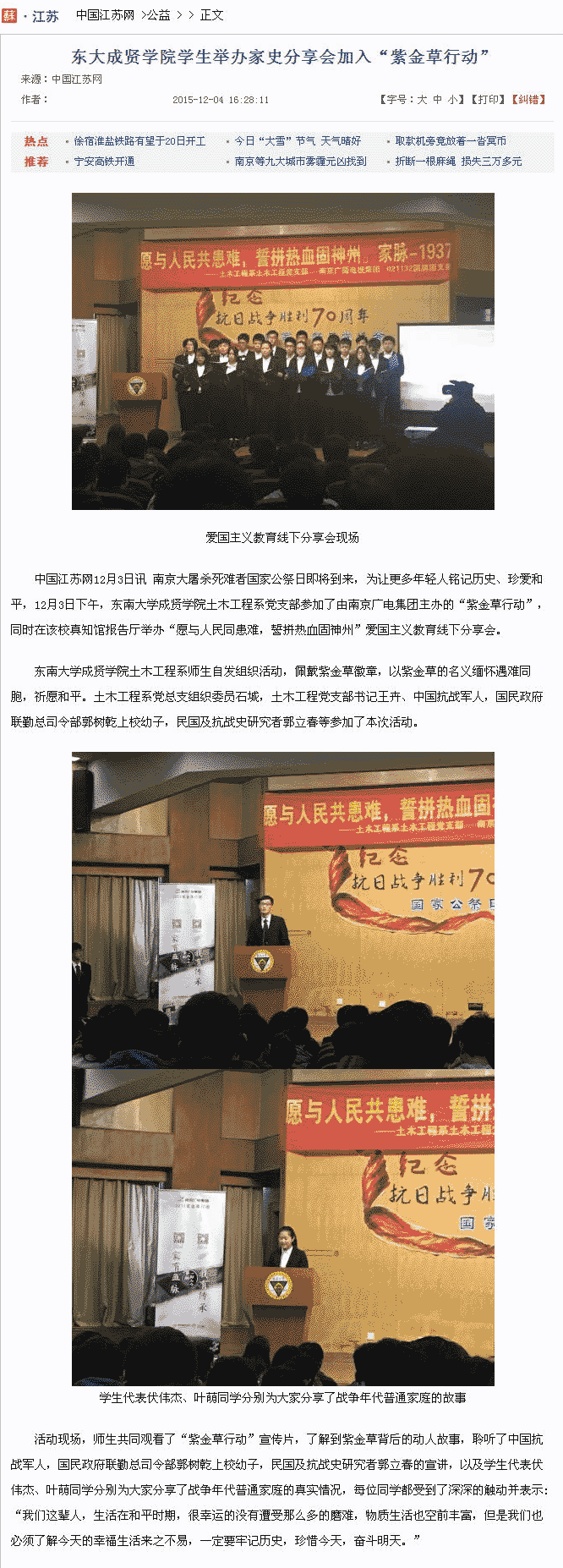 【中国江苏网】东大69vj 学生举办家史分享会加入“紫金草行动”