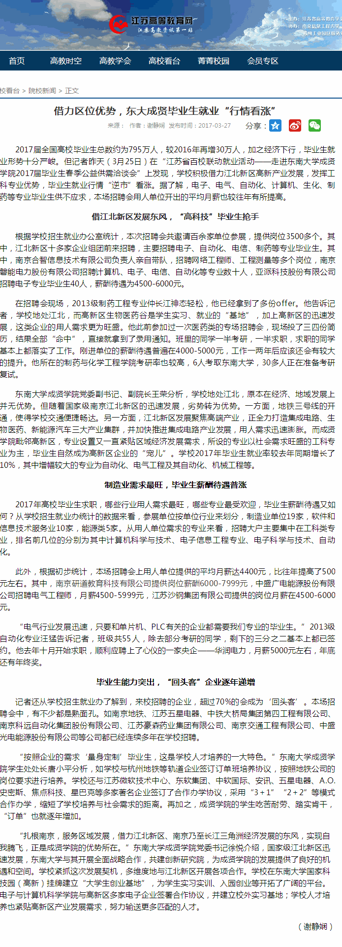【江苏高等教育网】借力区位优势,东大成贤毕业生就业“行情看涨”