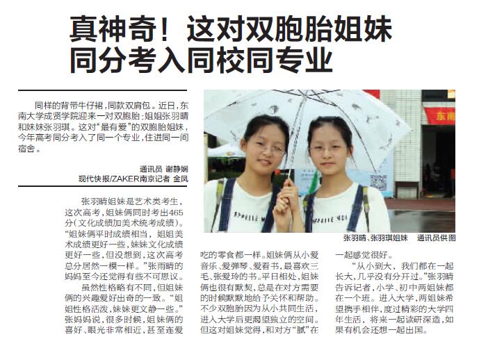 【现代快报】真神奇!这对双胞胎姐妹同分考入同校同专业