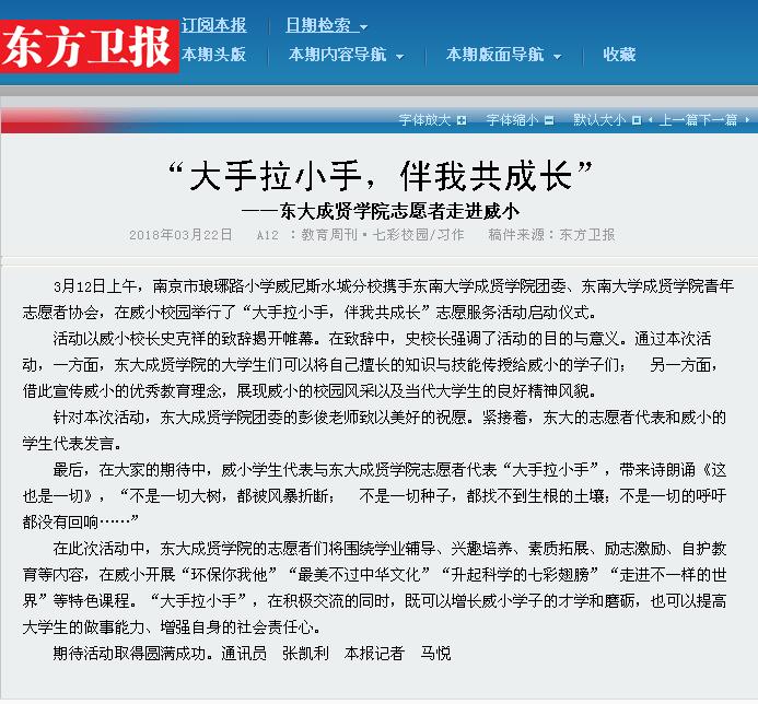 【东方卫报】“大手拉小手,伴我共成长”——东大69vj 志愿者走进威小