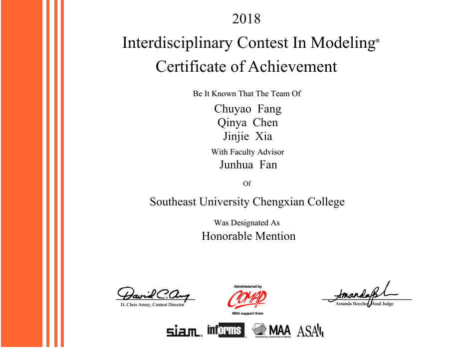2018年美国大学生数学建模竞赛于2月9日至13日举行。今年竞赛共有六道赛题,涉及通信、文化、新能源、气候等热点问题,每道赛题都具有很强的实际社会需求背景。竞赛以三名本科生为一组,要求学生在连续的99小时内,从六道题目中任选一题,完成从数学建模、模型求解、实验仿真和结果检验在内的完整的具有原创性的英文论文,这对本科生来说是一项极具挑战的任务。我校参赛的三名学生在紧张有限的时间内废寝忘食、沉着应对,充分展现出了我校学生面对挑战时坚毅的拼搏精神。