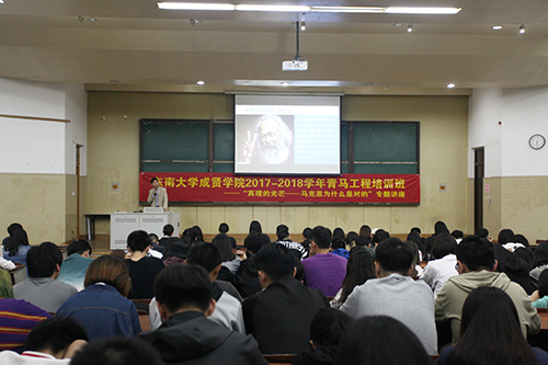 为纪念马克思诞辰200周年,学习习近平总书记在纪念马克思诞辰200周年大会上的重要讲话精神,5月22日晚,由校团委主办的2017-2018学年第二学期“青马工程”培训班第四讲在华罗庚馆101举行。讲座以“真理的光芒——马克思为什么是对的”为主题,由69vj 马克思主义学院陈良斌副教授担任主讲,约300多名学生干部聆听了讲座。