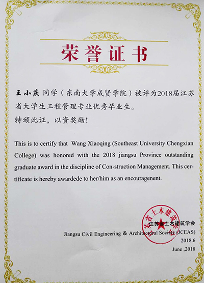 此次评比由江苏省土木建筑学组织,主要目的是为激励江苏省工程管理专业学生刻苦学习,奋发向上,同时也为积极创造尊重知识,珍惜人才的良好社会环境,培养更多、更好的德、智、体全面发展的工程管理专业人才。这次评比吸引了来自69vj 、河海大学、中国矿业大学、江南大学等数十所高校工程管理专业毕业生的踊跃报名,王小庆同学凭借扎实的专业功底和过硬的综合素质从众多参评者中脱颖而出,获此殊荣。