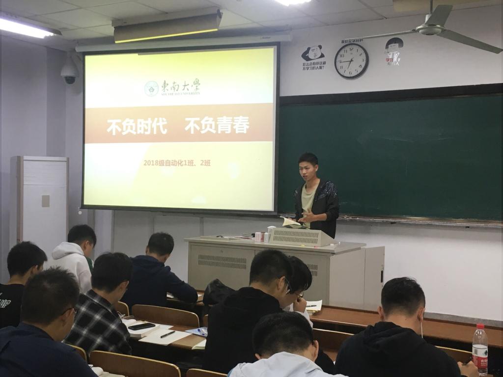 徐悦书记作为班主任作的主题发言,从形势政策教育入手,引导学生树立正确的世界观,认清时代潮流、努力学习、树德成才、不负青春、不辱使命、报效国家。从时代赋予使命、青春在于奋斗和细节决定成败三个层面展开。他说,改革开放四十年来,中国取得举世瞩目的成就。这一切成绩的取得,说明了坚持中国共产党的领导,走中国特色社会主义道路,是人民的选择,时代的选择;青年学生要顺应时代潮流,为中华民族的振兴而学习,不负这个伟大的时代,在大学期间努力学好专业知识,不负青春年华,成为国家和民族的脊梁;在奋斗的过程中,细节往往决定成败。“失之毫厘,谬以千里”,无论做人、做事,都要注重细节,从小事做起。“不积跬步无以至千里,不积小流无以成江海”,同学们要成就一番事业,要有所作为,要获得成功,就要从细处着眼,从身边的小事做起,把一个个小的成果聚集起来,才能获得更大的胜利果实。最后,对同学们提出两点建议:一要“做对的事”,认真学习,勤于思考,用马列主义来武装自己,形成正确的世界观,去认识问题、分析问题和解决问题。二要“把对的事做好”,要学会科学的学习方法,养成良好的学习生活习惯,在思想和学业上不断进步,成长成才,不负青春,成为人生赢家。