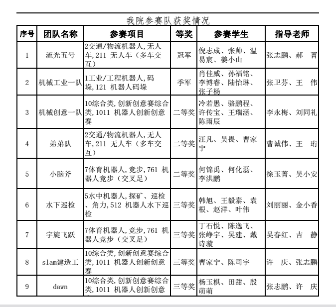 本次大赛中,我校参赛代表队取得了优异成绩,获得一等奖(冠军)一项,二等奖四项,三等奖四项。