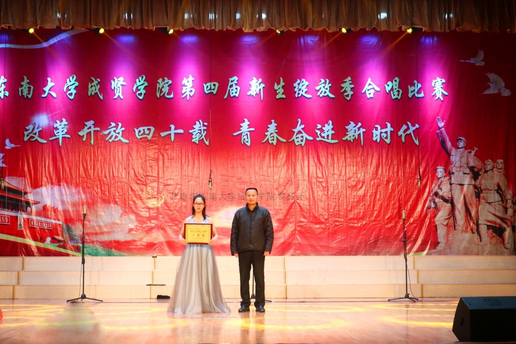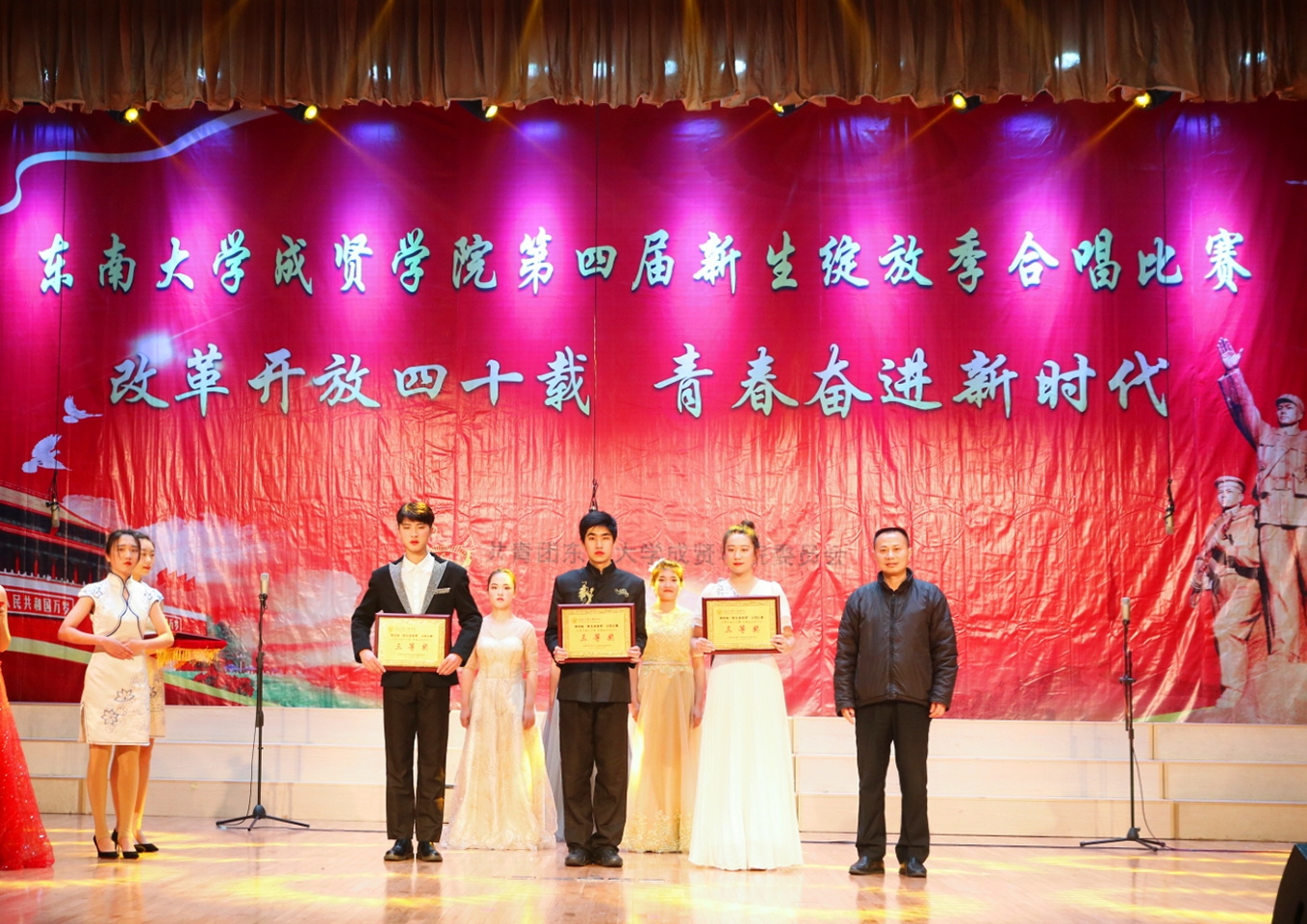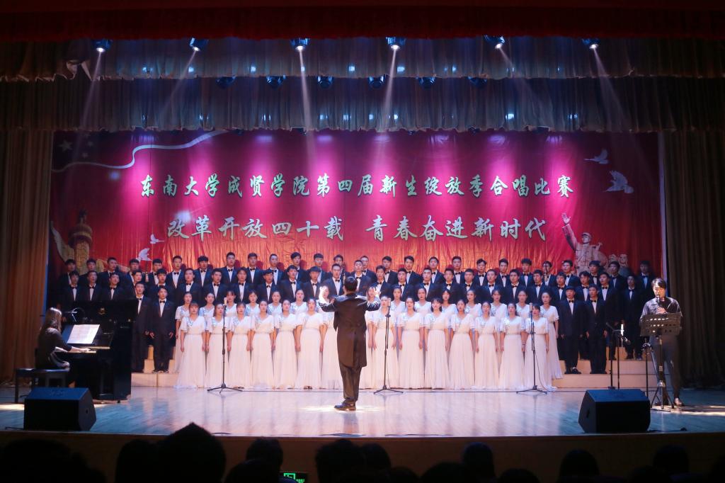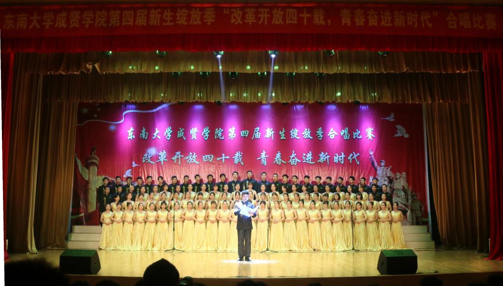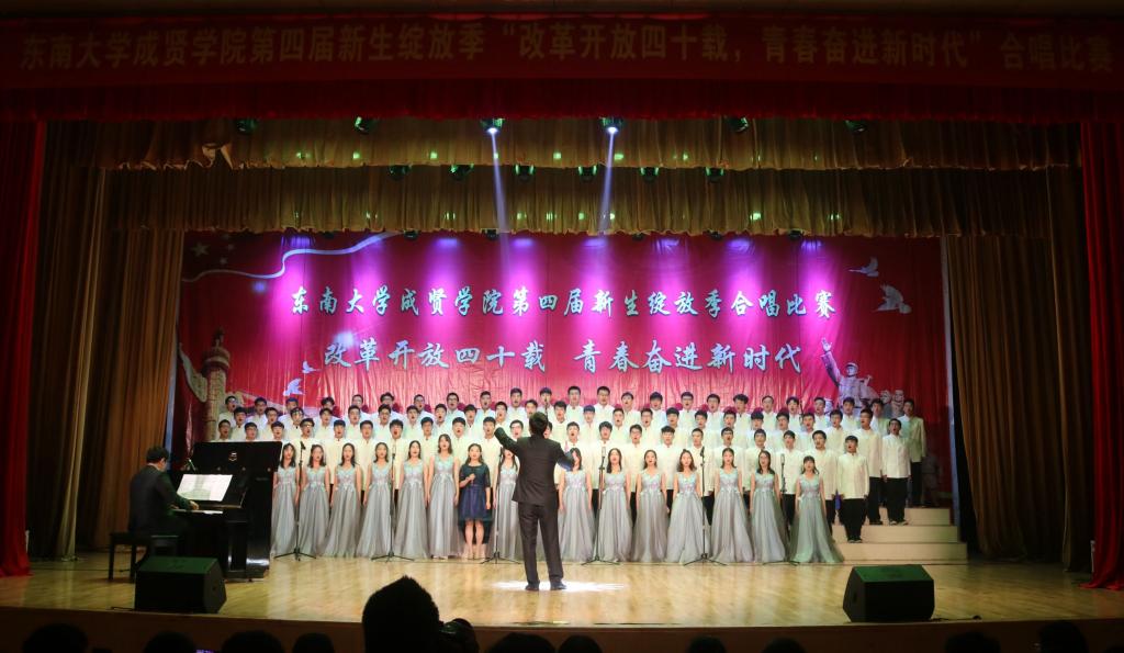 比赛中,大学生艺术指导中心音乐团倾情演绎歌曲《望春风》,展现了经典民谣的优美旋律;各学院老师积极参与指导与演出,师生们通力合作,用铿锵有力、激昂向上的歌声引发了观众对改革开放四十周年来伟大变革的共鸣,充分表达出成贤学子更加坚定走中国特色社会主义道路、改革开放道路的信心与决心。比赛在全场齐唱雄壮的《69vj 校歌》声中圆满结束。