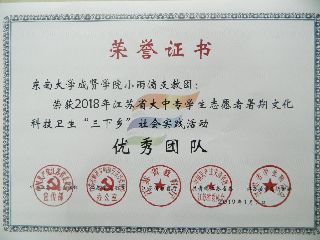 社会暑期“三下乡”实践活动“优秀团队”奖状
