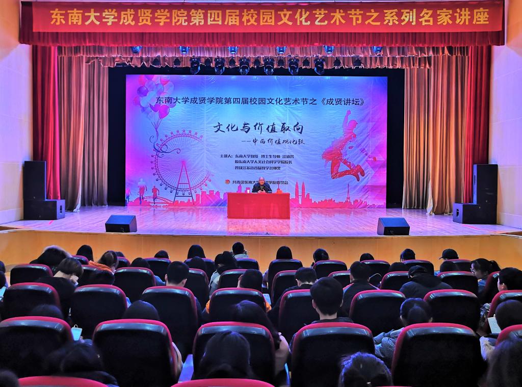 报告会伊始,江教授讲述了中西方价值观的差异点和深层理念,引发了同学们对中西方价值观发展趋势的思考。接着,江教授以中西方建筑风格和经济体为例,详细的分析了造成中西方价值观差异的五种原因,让现场师生对价值观的起源和发展有了更深刻的理解。最后,江教授提出将中华民族文化传统中的优秀成分转化成具有世界意义的文化价值资源观点,鼓励同学们在继承和发扬我国优秀文化的基础上,有选择地吸收和借鉴国外的有益经验。整场报告会座无虚席,掌声不断,现场气氛热烈。