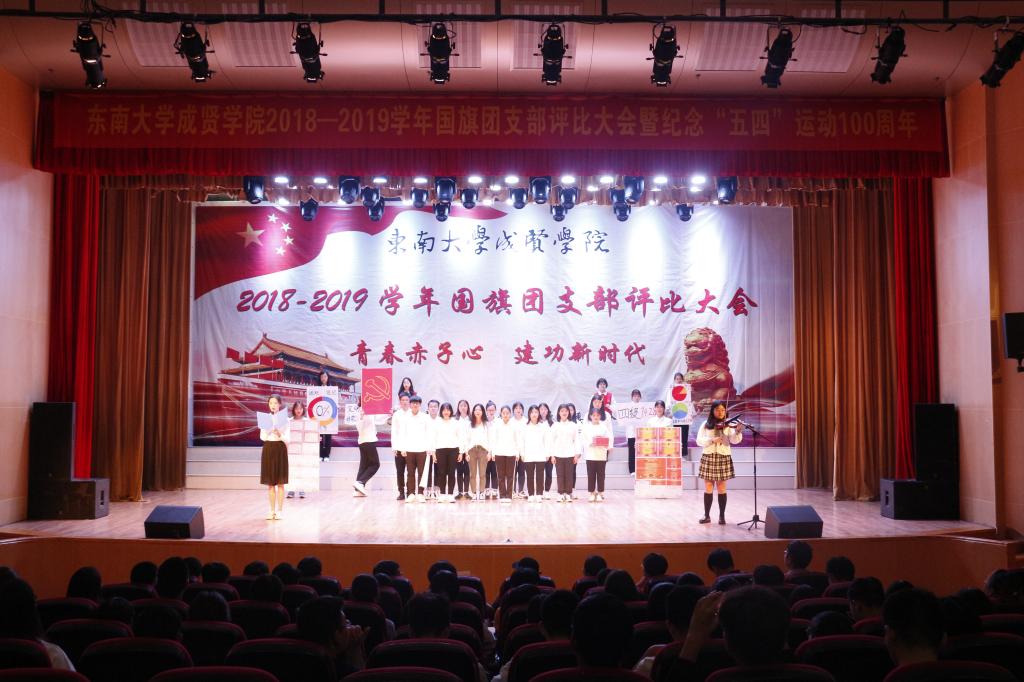 大会以慷慨激昂的《光荣啊,中国共青团》团歌拉开帷幕,紧接着,通过短视频回顾了上一年优秀特级团支部的风采。随后,入选的9个团支部根据抽签顺序展示了各支部在基层团支部建设、班风学风建设、思想教育建设上取得的进展与成绩,评委根据各支部递交的材料及现场的展示、答辩各方面情况进行综合打分。经过激烈角逐,2017级建筑学1团支部获新年度“国旗团支部”“活力团支部”荣誉称号;2017级交通运输1团支部、2017级药事管理2团支部获“活力团支部”荣誉称号。