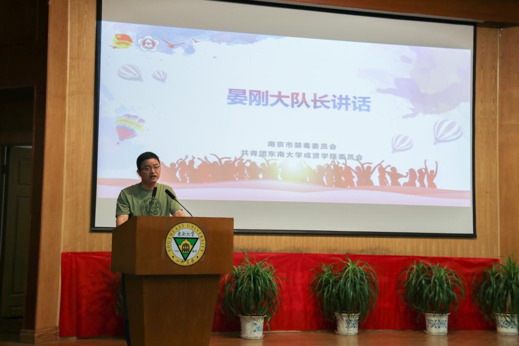 启动仪式上,团委书记潘明烽首先对南京市禁毒支队一行来我校指导禁毒宣传工作表示欢迎,随后他总结了近三年我校在禁毒宣传工作方面取得的成效和不足,并对我校志愿者提出了新的希望和要求。晏刚大队长充分肯定了我校志愿者在南京市禁毒工作中发挥的重要作用,对在禁毒工作中默默付出的师生表示感谢,希望我校志愿者能一如既往地支持禁毒事业,开展形式多样、丰富多彩的禁毒主题活动。随后,陈林警官现场弹唱了《禁毒志愿者之歌》,倡导警民携手、全员参与,为打造无毒、平安的美好南京添砖加瓦。最后,全体禁毒志愿者进行庄严宣誓,表明了成贤学子禁毒宣传的坚定决心。
