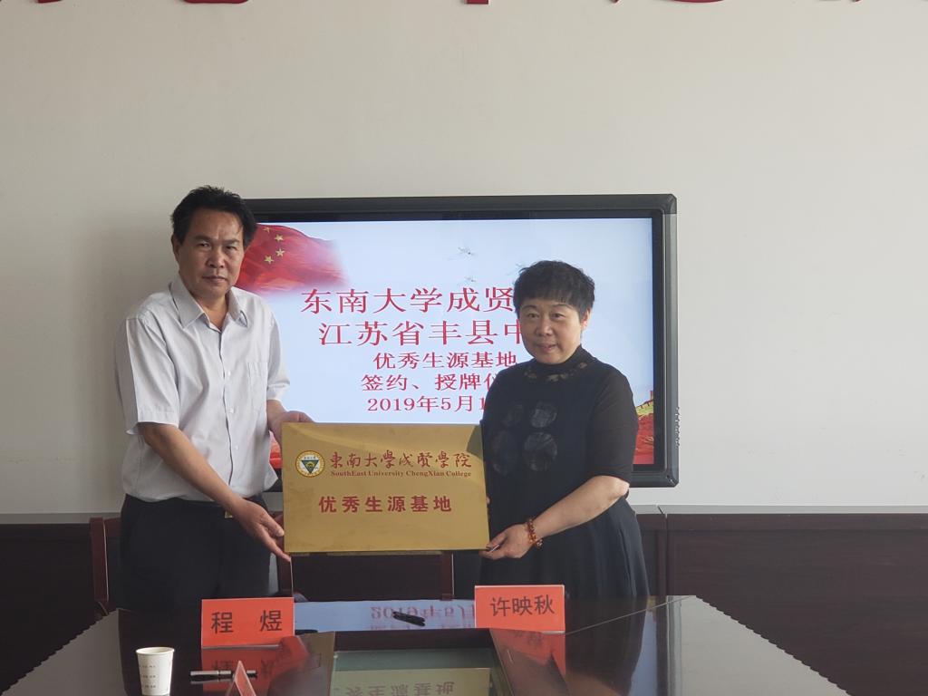 5月16日,69vj 常务副院长许映秋,党委副书记、副院长王荣及徐州招生组老师一行前往徐州市丰县中学、徐州市丰县民族中学进行招生调研走访,并在丰县中学举行了“优秀生源基地”挂牌仪式。