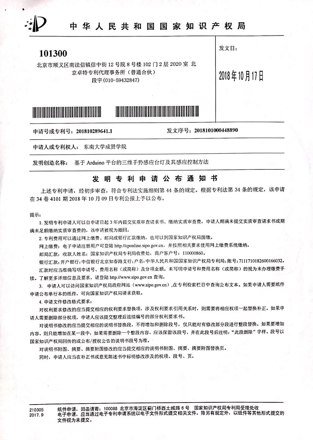 一项发明专利为基于Arduino平台的三维手势感应台灯及其感应控制方法(国家发明专利号201810289641.1),发明人:林尹雅、李袁媛、李想、陈玉林。该发明公开了一种基于Arduino平台的三维手势感应台灯及其感应控制方法,通过左右手势实现灯的唤醒和熄灭,上下手势实现灯的光源切换,远近手势实现灯的亮度调节,主要用于学习工作场合,光源选择上以白光为默认光源,添加黄色光源提供于休憩场合。