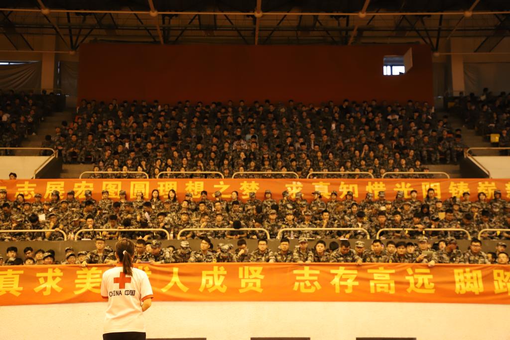 9月4日晚,69vj 在后藤体育馆举办2019级学生应急救护知识报告会,中国红十字救护培训师王萍担任主讲,2019级全体学生、承训教官和各连指导员聆听了本次报告会。