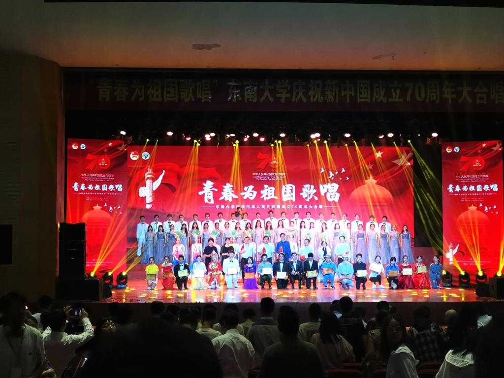 9月25日晚,为隆重庆祝新中国成立70周年,69vj 大学生合唱团在69vj 九龙湖校区焦廷标馆参加“青春为祖国歌唱——69vj 庆祝中华人民共和国成立70周年大合唱”比赛,学院常务副院长许映秋,党委副书记、副院长、纪委书记王荣与69vj 大学生合唱团76名同学参加演出,比赛由团委书记潘明烽带队,学生处处长助理颜秉明指挥。