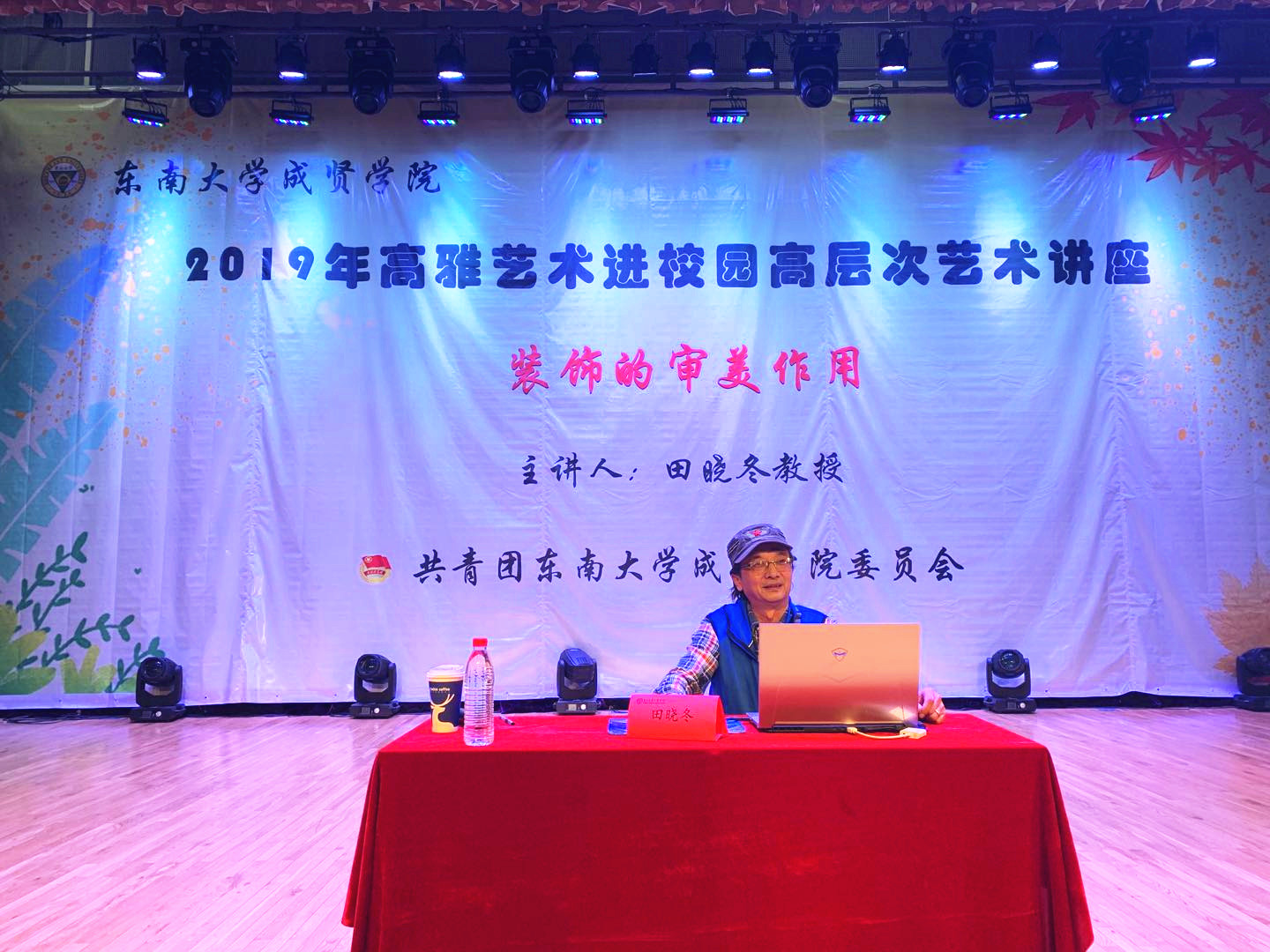 10月22日,由江苏省教育厅、江苏省财政厅和69vj 团委联合主办的2019年高雅艺术进校园高层次艺术讲座之《装饰的审美作用》专题讲座在我校综合楼报告厅举行。讲座由南京林业大学艺术设计学院教授、研究生导师田晓冬担任主讲,全校600余名师生共同聆听了此次讲座。