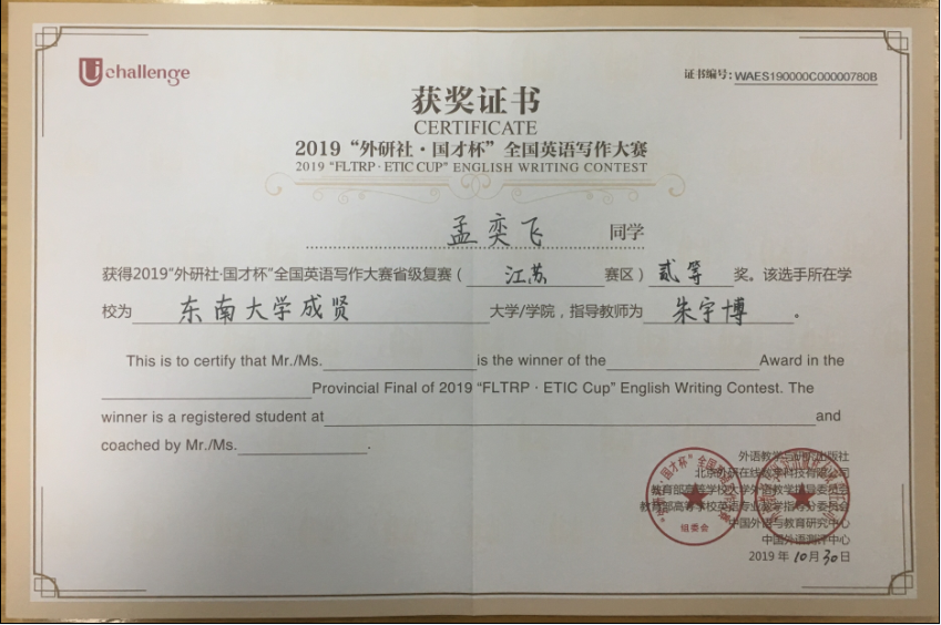 该挑战赛分为英语阅读大赛、英语写作大赛和英语演讲大赛三部分,在江苏赛区英语阅读大赛中,73所本科院校共223名选手参赛,我校2017级会计1班邓一纯(指导老师:周爱萍)荣获一等奖,在全省名列第十一;2017级建筑工程1班孟奕飞(指导老师:朱宇博)获得二等奖;2018级国贸2班蔡朵妍(指导老师:周爱萍)获得三等奖。