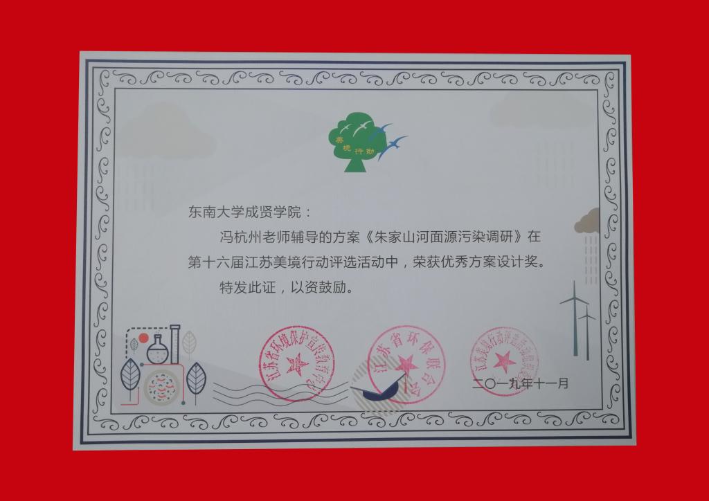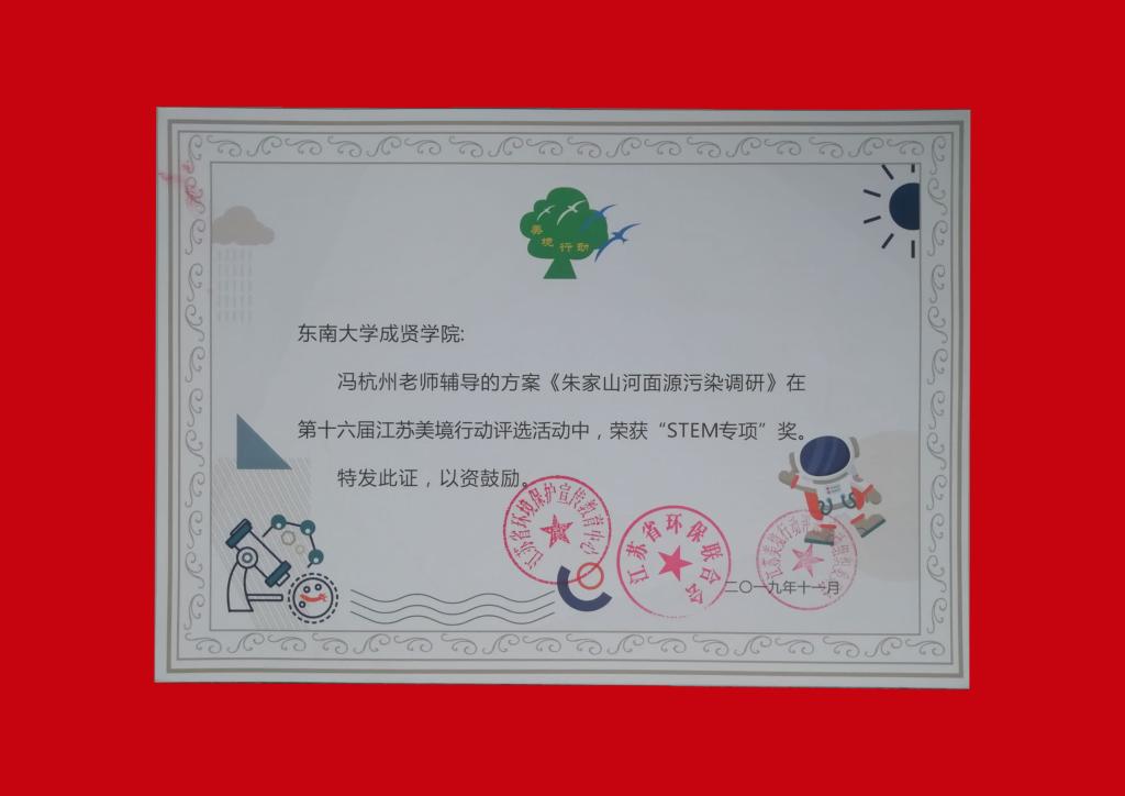 第十六届江苏美境行动得到了全省大、中、小学校的积极响应,有130多所参与美境行动的学校报名参赛,经组委会资格审查和专家评选小组评定,最终46个环保项目入围优秀方案实施奖、13个实施方案入围STEM专项奖。自活动开展以来,我校“河长小清”实践团队在团委冯杭州老师的指导下,积极筹备,通过走访、水质检测、问卷等调研方式,研究了朱家山河的水文特征,经过线上和现场展示,我校递交的实施方案《朱家山河面源污染调研》得到主办方高度认可,荣获“STEM专项奖”与“优秀方案设计奖”。