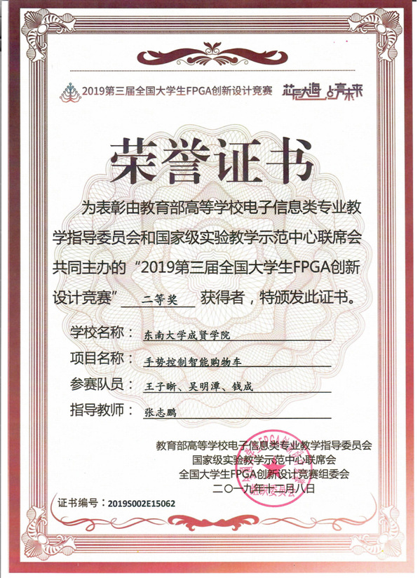 总决赛于12月6日至12月8日在南京江北新区ICisC人才实训基地举办。我校电子与计算机工程学院张志鹏老师指导的多个项目组进入全国总决赛,最终“我去深海捞板子”团队王子晰、吴明潭、钱成制作的《手势遥控智能购物机器人》获得“全国二等奖”,该项目同时获得上海安路信息科技有限公司“企业特别奖”。