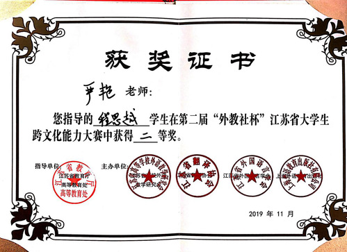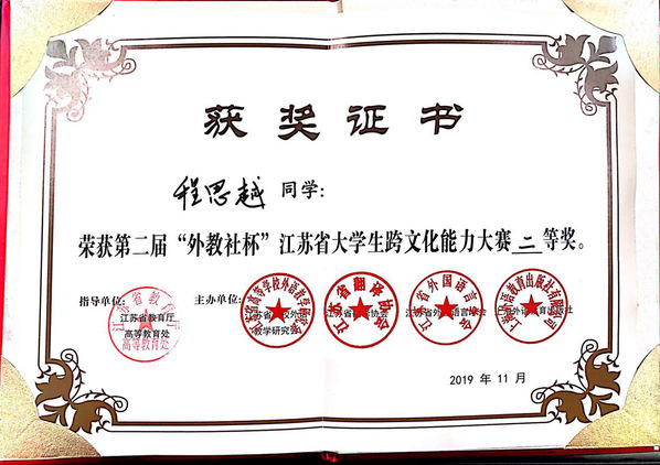 11月20日,第二届“外教社杯”江苏省大学生跨文化能力在扬州大学成功举行,来自江苏省各大本科及高职院校的在读学生,留学生及指导老师和评委共计约150人与会。69vj 首次组织学生参赛,经过激烈的角逐,2017级会计1班的程思越同学荣获二等奖,展示了良好的英语语言能力和跨文化交际能力。