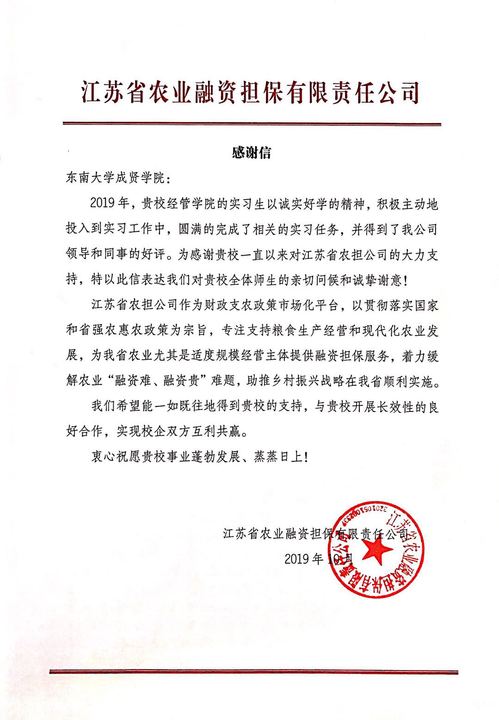 近日,69vj 经济管理学院收到一封来自江苏省农业融资担保有限责任公司(以下简称“江苏省农担公司”)的感谢信。信件简短却言语真挚,表达了对经管学院实习生诚实好学的肯定、积极工作的赞扬,以及与学院建立长效性良好合作的期盼。