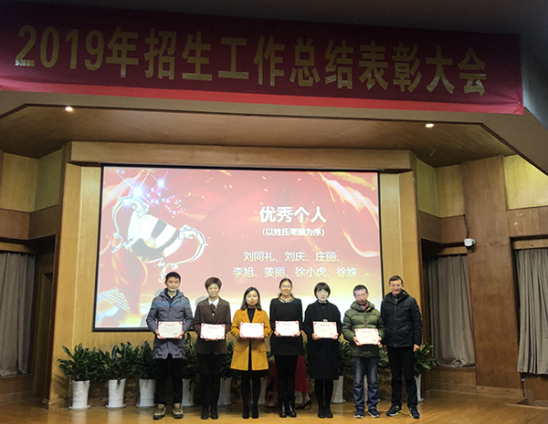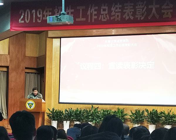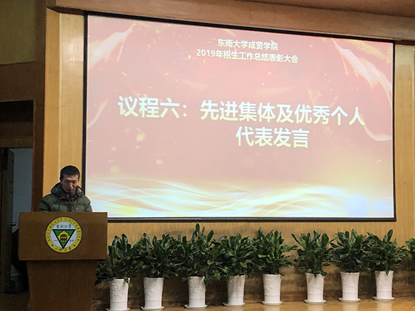 常务副院长许映秋宣读表彰决定,对2019年招生宣传工作的13个先进集体和7名优秀个人进行表彰。先进集体代表徐州组李洪全老师和优秀个人代表刘同礼老师分别发言,结合实际招生体验,分享招生感悟。