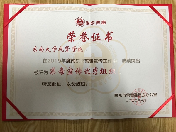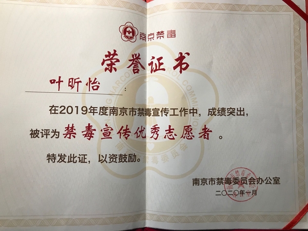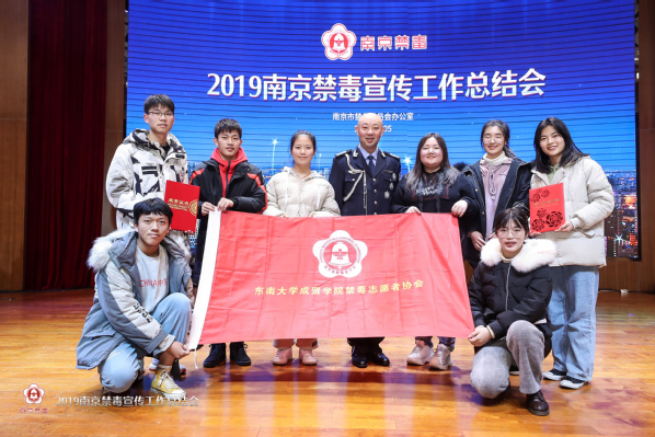 2020年1月5日,2019南京禁毒宣传工作总结会在南京师范大学仙林校区音乐厅召开。省禁毒办常务副主任、省公安厅禁毒总队总队长张波,市局党委委员、市禁毒委副主任曹存福,市禁毒办副主任、市公安局禁毒支队支队长仲军,市教育局宣传与德育工作处处长完进、市公安局禁毒支队副支队长刘庆峰、团市委副调研员陶涛以及各地区高校禁毒志愿者们参加了本次禁毒宣传工作总结表彰会。69vj 青年志愿者协会因2019年在禁毒宣传工作上表现突出,被评为“禁毒宣传优秀组织”,我校叶昕怡同学被评为“优秀志愿者”。