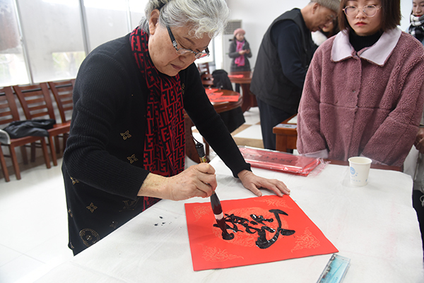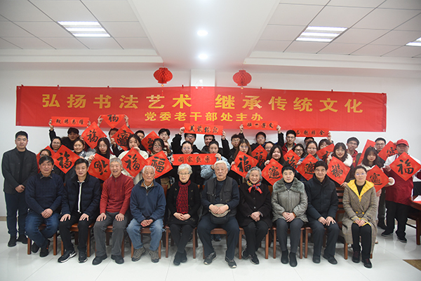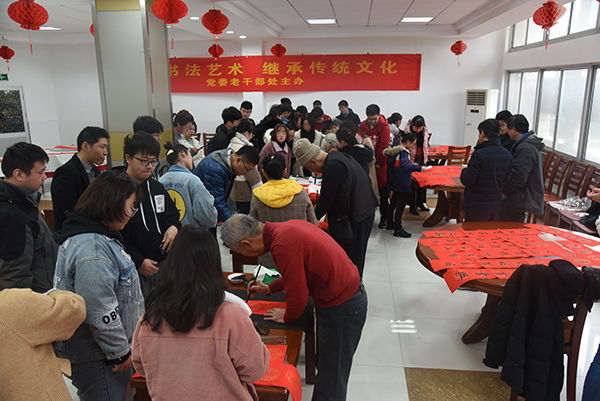 为传承中华传统文化,发挥老同志的政治优势,结合“不忘初心、牢记使命”主题教育,1月7日,69vj 党委老干部处组织了以“弘扬书法艺术、传承传统文化”为主题的老干部书画进校园、进家庭、进社区活动,69vj 退休老同志在一食堂梅花厅为69vj 师生员工写春联、送祝福。