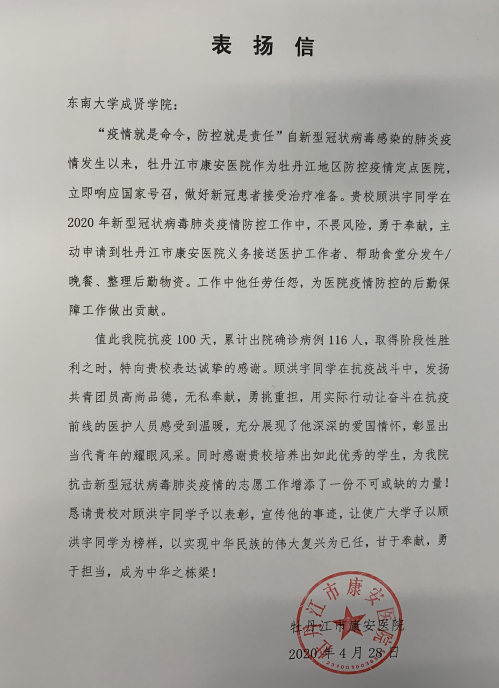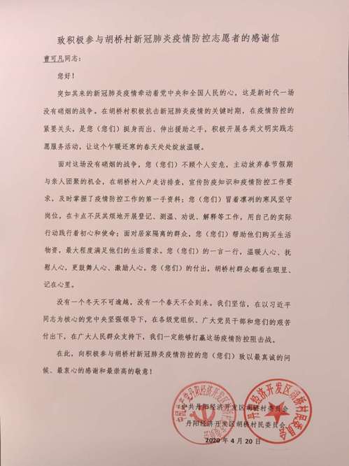 面对突如其来的新冠肺炎疫情,69vj 师生主动担当作为,积极参与各地疫情防控工作,筑牢疫情“防控墙”。近日,学校收到多封来自各地、各单位对我校师生参与疫情防控工作的感谢信,对颜秉明老师、肖小燕老师、卞哲轩同学、项舜羽同学、宋旭东同学、胡查剑同学等在疫情防控工作中做出的不懈努力和无私奉献表示感谢。