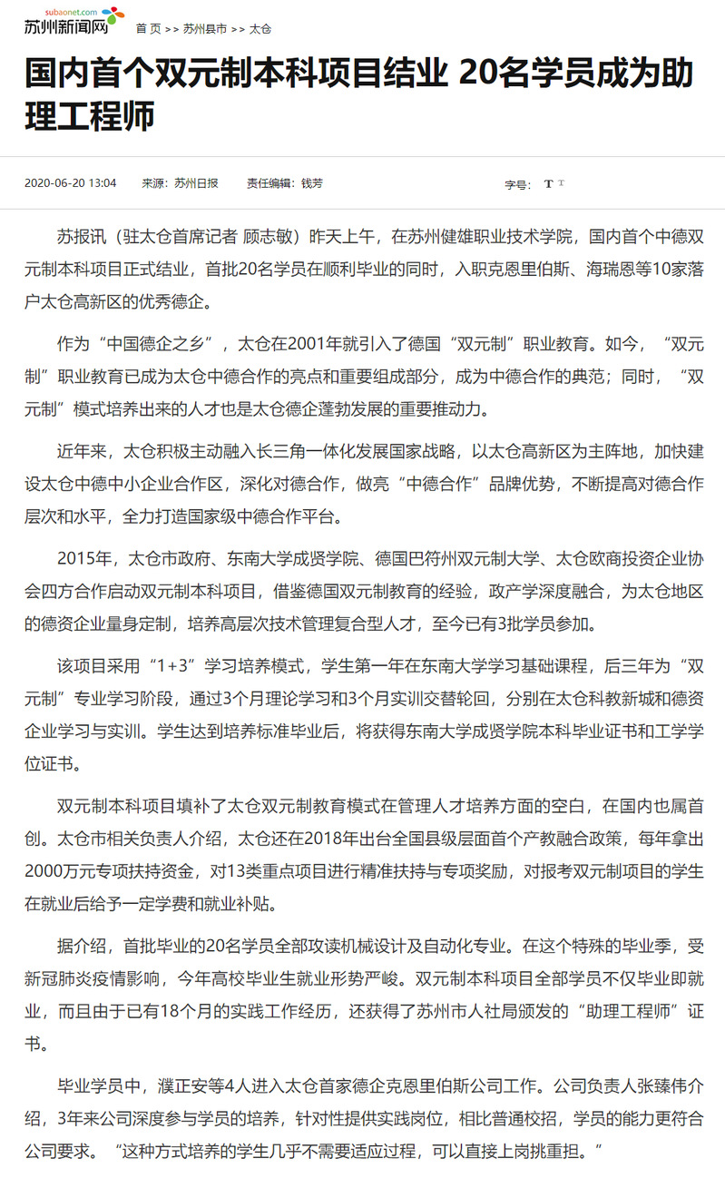 【苏州新闻网】国内首个双元制本科项目结业 20名学员成为助理工程师