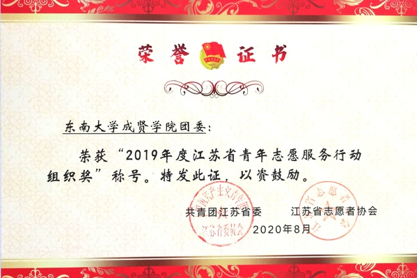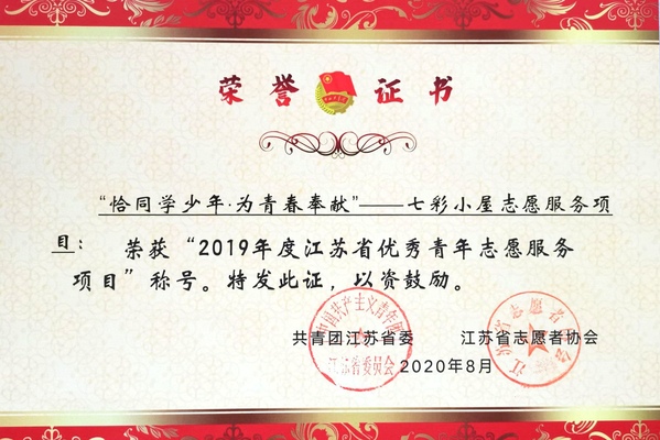 “恰同学少年,为青春奉献”——七彩小屋志愿服务项目围绕关爱儿童深入开展,志愿者以手工制作、社团活动等多种形式与孩子们进行互动,传播温暖,被评为“江苏省优秀青年志愿服务项目”;69vj 团委荣获“江苏省青年志愿服务行动组织奖”;69vj 团委冯杭州老师为志愿事业无私奉献,荣获“江苏省青年志愿服务事业贡献奖”;电子与计算机工程学院2017级软件工程专业学生施翔、2017级自动化专业学生张鑫积极组织并参加各项志愿服务活动,服务奉献社会,作为我校青年志愿者优秀代表,获得了“江苏省优秀青年志愿者”的荣誉称号。