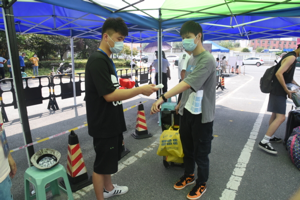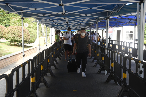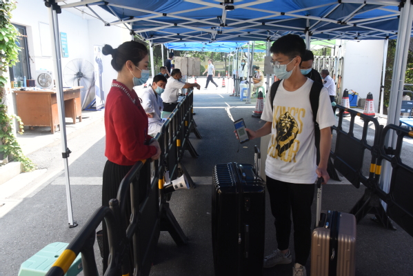 测量体温、出示苏康码、查验证件、返回宿舍……8月23日,69vj 2020年秋季学期首批返校学生秩序井然地回归阔别已久的校园。