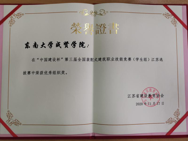 11月16日,2020年全国行业职业技能竞赛——“中国建设杯”第三届全国装配式建筑职业技能竞赛(学生组)江苏选拔赛在江苏城乡建设职业学院举行,来自全省建设类院校的23支队伍参加比赛,69vj 土木与交通工程学院代表队在董国庆、倪小磊老师的带领下,获得建筑信息模型技术员土建组第三名三等奖的佳绩,69vj 获得优秀组织奖。
