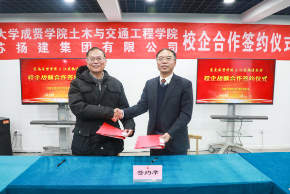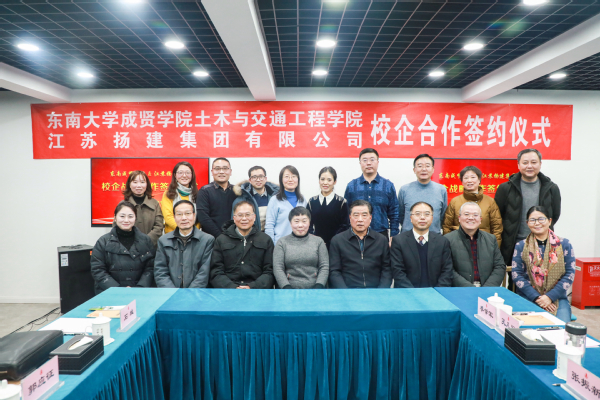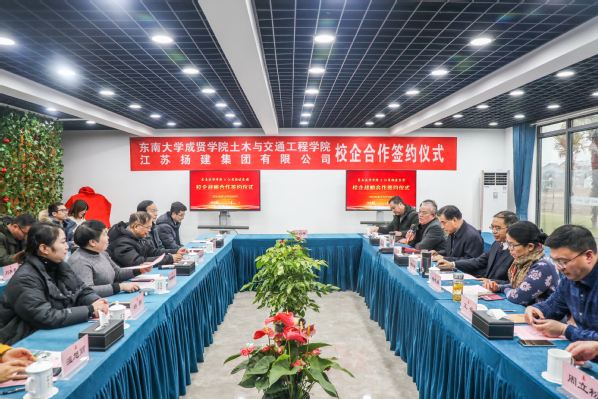 12月18日,土木与交通工程学院与江苏扬建集团有限公司校企合作签约仪式在江苏扬建集团有限公司举行。69vj 常务副院长许映秋,土木与交通工程学院院长郭正兴、党总支书记杨阳、常务副院长郭应征、副院长温旭丽、综合办公室主任石城以及各系主任、骨干教师,江苏扬建集团有限公司总裁梁云彪、总经理邹厚存、党委副书记张振兴、副总裁杨志娟、人力资源部部长孔凡裕、总经理助理王荣以及各分公司负责人出席了签约仪式。活动由扬建集团党委副书记张振新主持。
