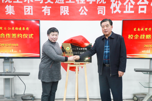 扬建集团总裁梁云彪首先对来访的我校各位领导、老师表示欢迎,希望加强与我校土木与交通工程学院的校企合作,扩展实习、实训场所,在实训中不断提升工程实践能力,提升专业素养。扬建集团总经理邹厚存就公司的管理团队、组织发展、科创能力、企业产业链等近年来的发展情况向与会领导和老师做了介绍。许映秋常务副院长对扬建集团各位领导的热情接待表示感谢,并向与会领导介绍了69vj 的办学历史、教学质量、建设发展情况。土木与交通工程学院院长郭正兴围绕学院创建“江苏省一流专业”,向与会领导介绍了学院在专业建设、师资队伍建设、人才培养以及校企合作等方面的情况,希望加深与扬建集团的合作,采取“3+1”、“3.5+0.5”、“订单式培养”等多种模式,为企业输送优秀的人才。最后,郭正兴院长与邹厚存总经理共同签订了校企合作协议,许映秋常务副院长与梁云彪总裁共同为“69vj 土木与交通工程学院校外实习实训基地”揭牌。