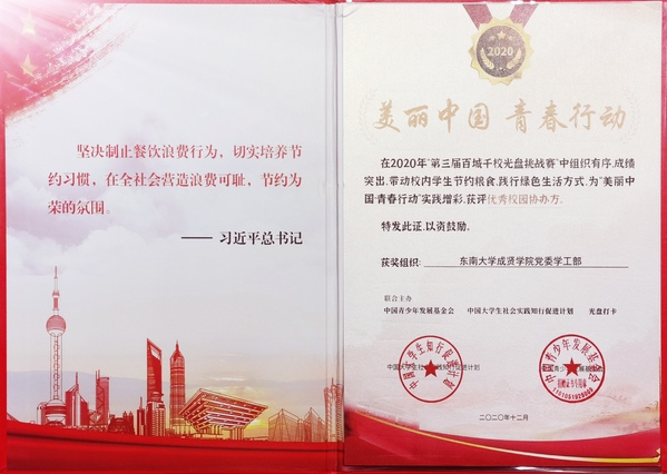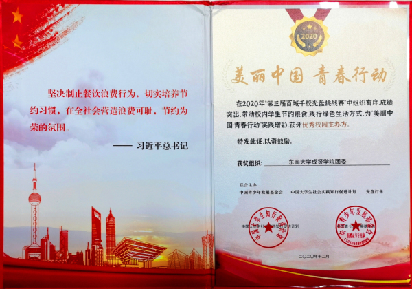 在第三届“百城千校光盘行动挑战赛”中,我校学生积极参与,用实际行动践行绿色生活方式,表现突出,69vj 党委学工部和团委,分别获评挑战赛“优秀校园协办方”“优秀校园主办方”称号。